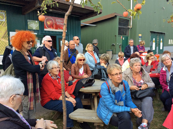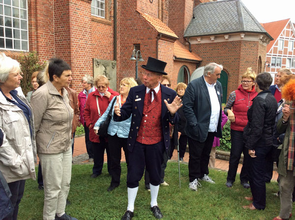 Der Montag führte uns nach frühem Aufbruch ins “Alte Land” südlich von Hamburg mit Schwerpunkt um Jork. Hier konnten wir große reetgedeckte Bauernhäuser im prachtvollen Fachwerkstil bewundern. Besonders eindrucksvoll waren die sogenannten “Prunkpforten” mit reichhaltigem Schnitzwerk, verzierten Torbögen, die zur Begrüßung von Gästen und als Zeichen des Wohlstands des Besitzers gedacht waren.Auf einem der zahlreichen Apfelhöfe wurden wir bei der Besichtigung mit einer kräftigen Gulaschsuppe gestärkt. Später durften wir hier in Jork einem Orgelkonzert in der Matthias-Kirche lauschen. Auf der Rückfahrt zum Hotel geriet unsere Busfahrerin auf einer Landstraße in eine Straßensperre wegen Straßenbauarbeiten. Eine Wendemöglichkeit mit dem großen Bus gab es nicht. Kurzerhand stiegen einige beherzte Männer aus und trugen die Barrieren zur Seite, so dass Claudia passieren konnte! Beim Wiedereinstieg in den Bus wurden unsere “Retter” mit Beifall empfangen.