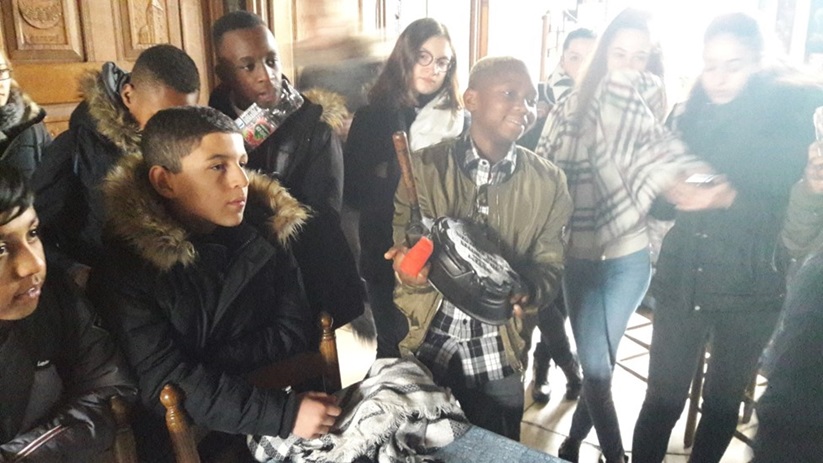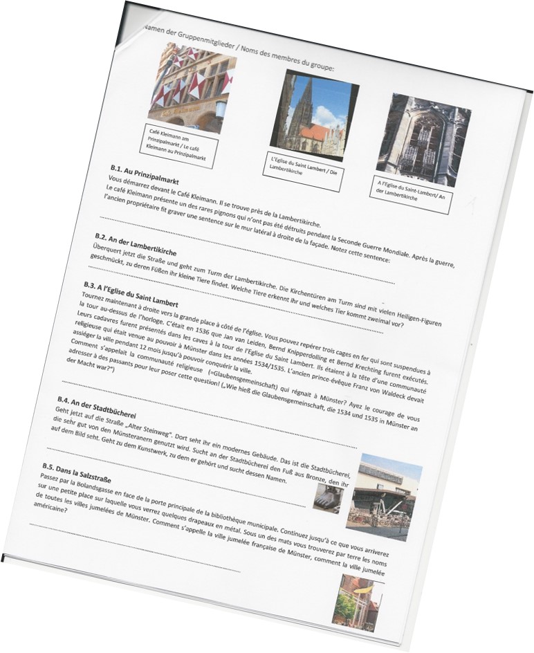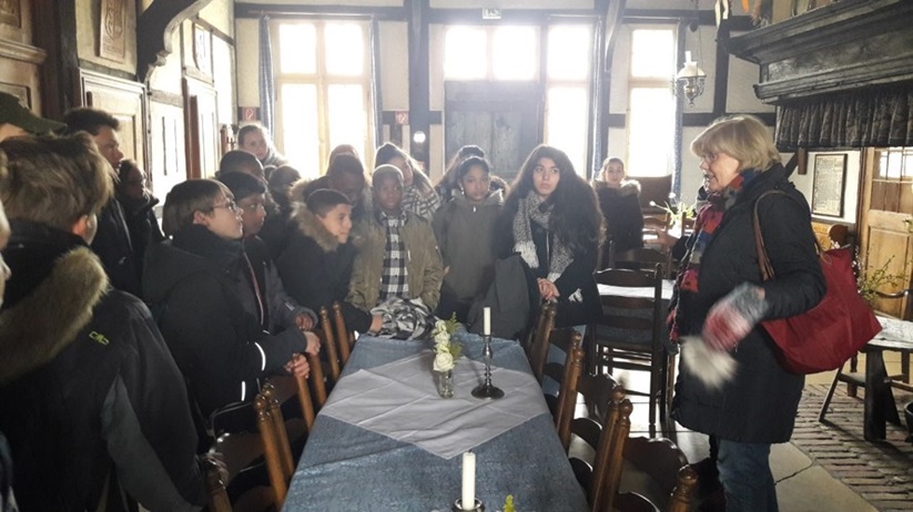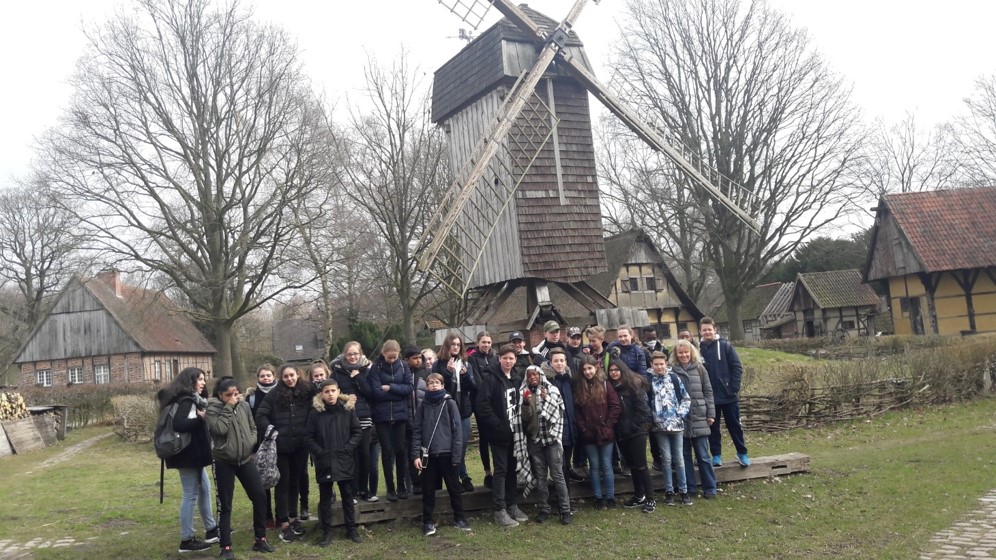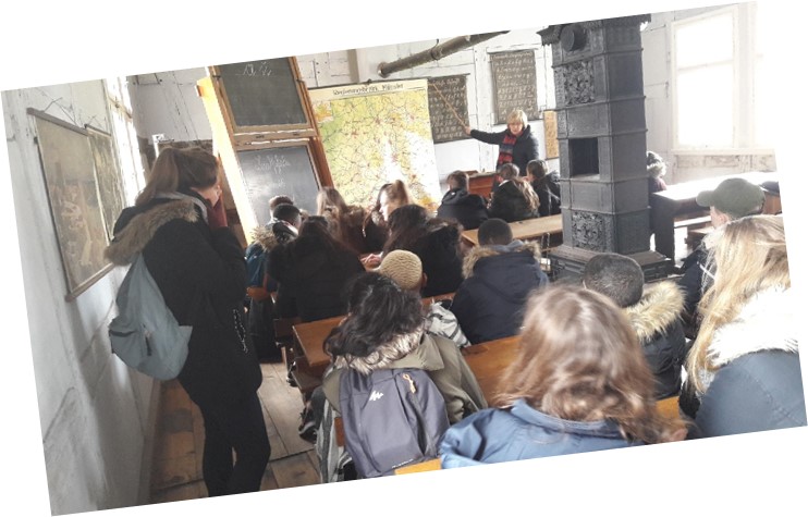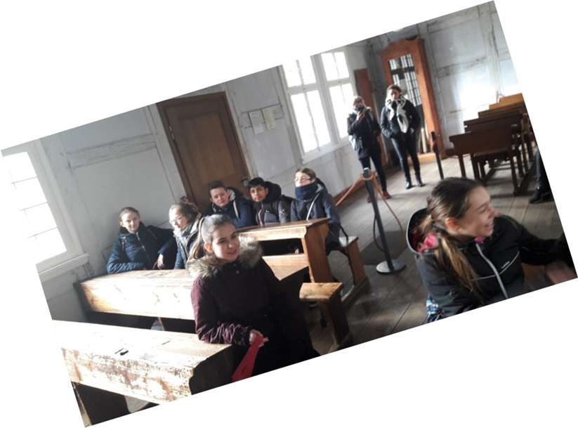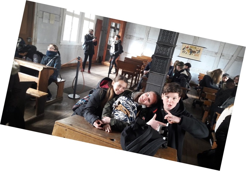 •Am Mittwochmorgen trafen wir uns am Bahnhof Marl-Sinsen, um von dort aus mit der S-Bahn nach Münster zu fahren. In Münster stiegen wir um in einen Bus und fuhren zum Freilichtmuseum Mühlenhof, wo wir 1 ½ Stunden eine sehr unterhaltsame zweisprachige Führung mitmachten. Höhepunkt der Führung war die Besichtigung eines Klassenzimmers aus alten Zeiten, wo die französischen und deutschen SchülerInnen gemeinsam die Schulbank drücken durften…