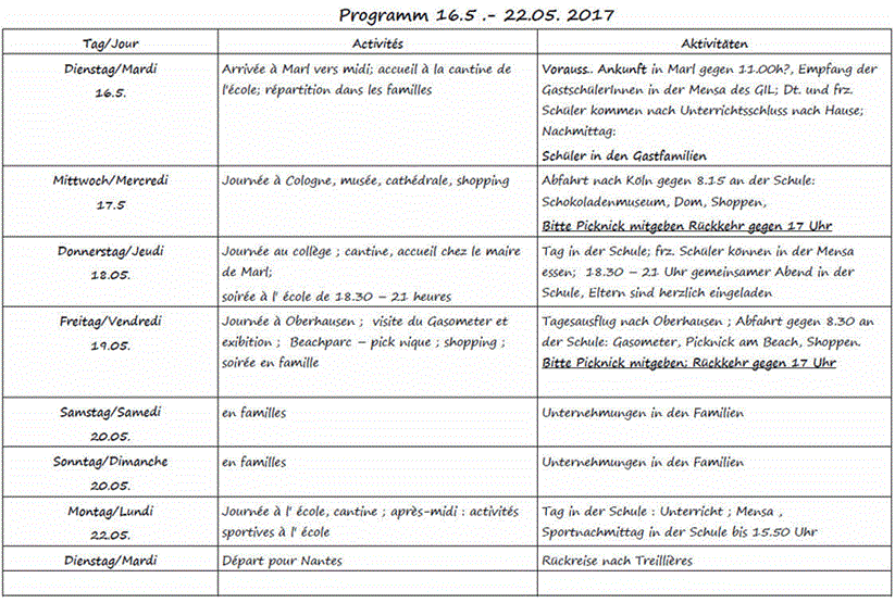 Frankreich AustauschEin Bericht von Sophia(8c)16.5.-23.05.17-Dienstag Morgen gegen 11:30 Uhr kamen die französischen Austauschschüler an und danach haben wir sie in der Mensa herzlich begrüßt, indem es leckeren Kuchen gab. Dann hatten wir erst einmal Freizeit und jeder konnte seine deutsche Austauschfamilie kennen lernen.-Am Mittwoch haben wir uns am GiL getroffen und in Köln den Tag verbracht. Dort waren wir in dem Kölner Dom und im Schokoladenmuseum. Wir haben gesehen, wie Schokolade hergestellt wird und auch am Schokoladenbrunnen probieren dürfen. Gegen 17 Uhr sind wir nach Hause gefahren und verbrachten erneut Zeit in unseren Familien.-Am Donnerstag hatten die Austauschschüler die Möglichkeit, an unserem Schulalltag teilzunehmen. Das heißt, dass die Austauschschüler von der 1. bis zur 9. Stunde mit in unseren Unterricht gekommen sind. Abends wurden von allen beteiligten viel Essen und zu Trinken zur Verfügung gestellt, um einen schönen gemeinsamen Abend zu verbringen.-Freitag sind wir nach Oberhausen zum Gasometer gefahren. Während die französischen Austauschschüler eine Führung hatten, konnten wir auf eigene Faust die Ausstellung über die Wunder der Natur besichtigen. Später hatten wir Zeit im Centro shoppen zu gehen.-Das Wochenende haben wir alle in unseren Familien verbracht. Viele sind in den Movie Park gefahren, einige konnten das Wochenende am Lagerfeuer mit Stockbrot und Marshmallows ausklingen lassen.-Montag waren wir alle in der Schule, um einen gemeinsamen Sportnachmittag zu erleben. Danach hatten alle die Möglichkeit sich auf die anstehende Rückfahrt vorzubereiten.Fazit: Die Aktivitäten haben insgesamt viel Spaß gemacht. Die Verständigung innerhalb der Familien war teilweise schwierig, dennoch wurde sich viel Mühe gegeben, um gut miteinander auszukommen.